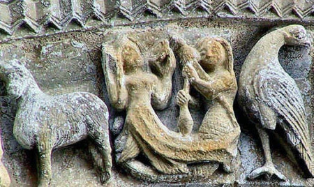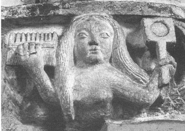 Sul portale di una chiesa a Vouvant in Francia si trovano due immagini della Sirena: una con i tipici attributi, il pettine e lo specchio, l'altra con in mano un fuso è nell'atto di filare.